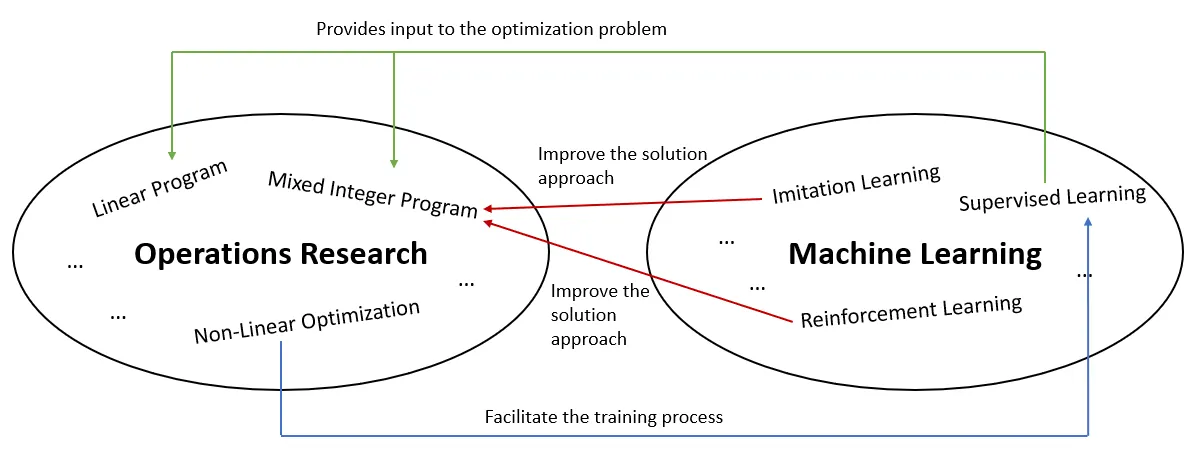Mặc dù ML nhận được nhiều sự chú ý và thường dễ tiếp cận hơn so với OR, hai lĩnh vực này thường được đem ra so sánh như những cách tiếp cận khác nhau. Nhưng khi nhìn sâu hơn, có thể thấy chúng hoàn toàn không phải đối thủ - mà ngược lại, bổ trợ cho nhau và hoạt động hiệu quả nhất khi kết hợp. Vì vậy, ta có thể đặt OR trong góc nhìn của ML - hoặc ngược lại. Thế mạnh của ML nằm ở việc đưa ra dự đoán, gợi ý và phân loại. Những đầu ra này sau đó được sử dụng bởi các hệ thống tối ưu hóa để đưa ra các quyết định tốt hơn.